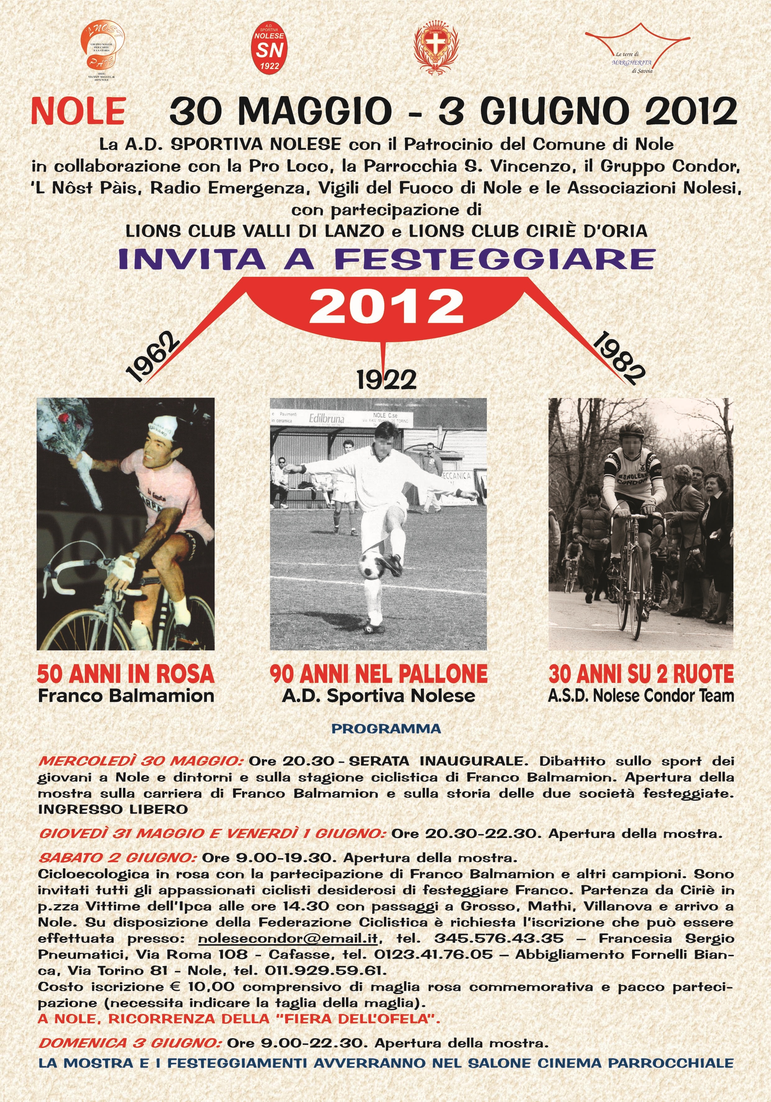 Sabato 2 Giugno , verranno festeggiate tre ricorrenze, 50  anni in Rosa di Franco Balmamion, 90° anno dalla fondazione della sportiva Nolese , e i 30 anni della Associazione ciclistica Condor, programma come da volantino allegato.
